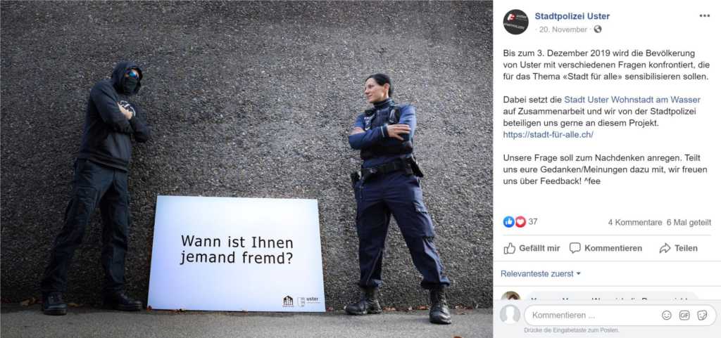Schon am ersten Tag bekam die «Fragenstellerei» Schützenhilfe von überraschender Seite. Die Stadtpolizei Uster konfrontierte Passanten in einer Unterführung mit der Frage „Wann ist Ihnen jemand fremd?“. Auf der Facebook-Seite der Stadtpolizei sind erste Antworten eingetroffen: Menschen mit Vorurteilen; Menschen, mit denen ich noch nie von Angesicht zu Angesicht ein Wort gewechselt habe; Menschen, deren Gesicht ich nicht erkennen kann; oder Menschen, deren Verhalten ich nicht zuordnen kann.